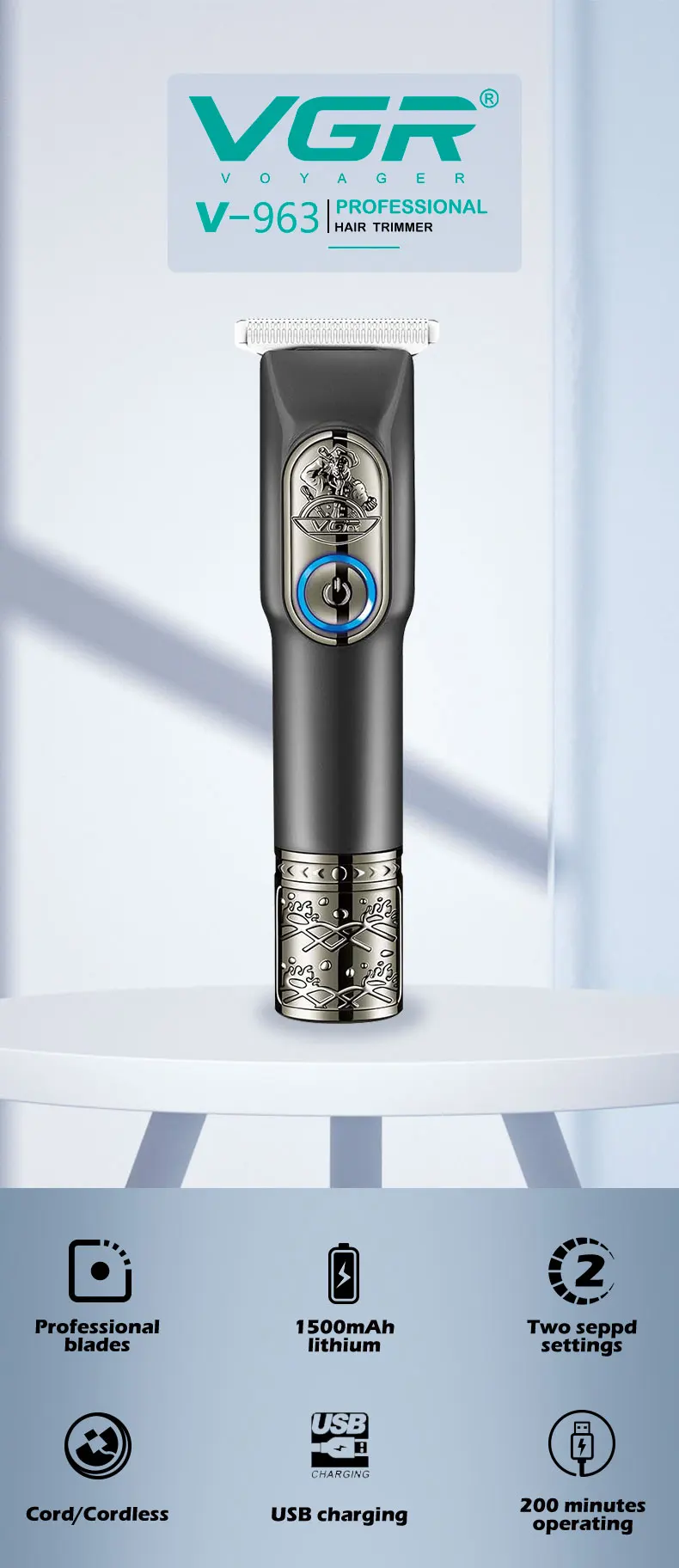 The V-963 is a vintage-style hair trimmer designed for efficient and convenient grooming. It offers several features to ensure a smooth and precise cutting experience.