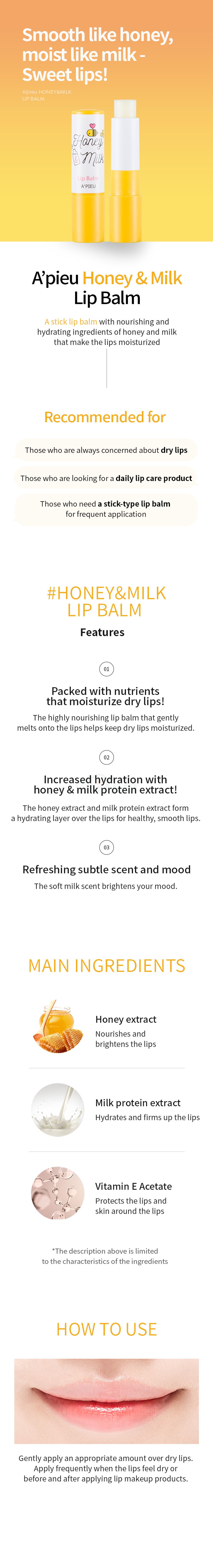 Nourish, and moisturize lips with the A'PIEU Honey & Milk Lip Balm 1. Nourish and moisturize dry lips - Rich lip balm melts into lips to provide and maintain moisture 2. Honey and milk extract provide intense moisture - Honey and milk protein extracts form a moisture barrier on the lips, keeping them healthy and smooth 3. Lightly fragranced - Subtle scent provides comfort